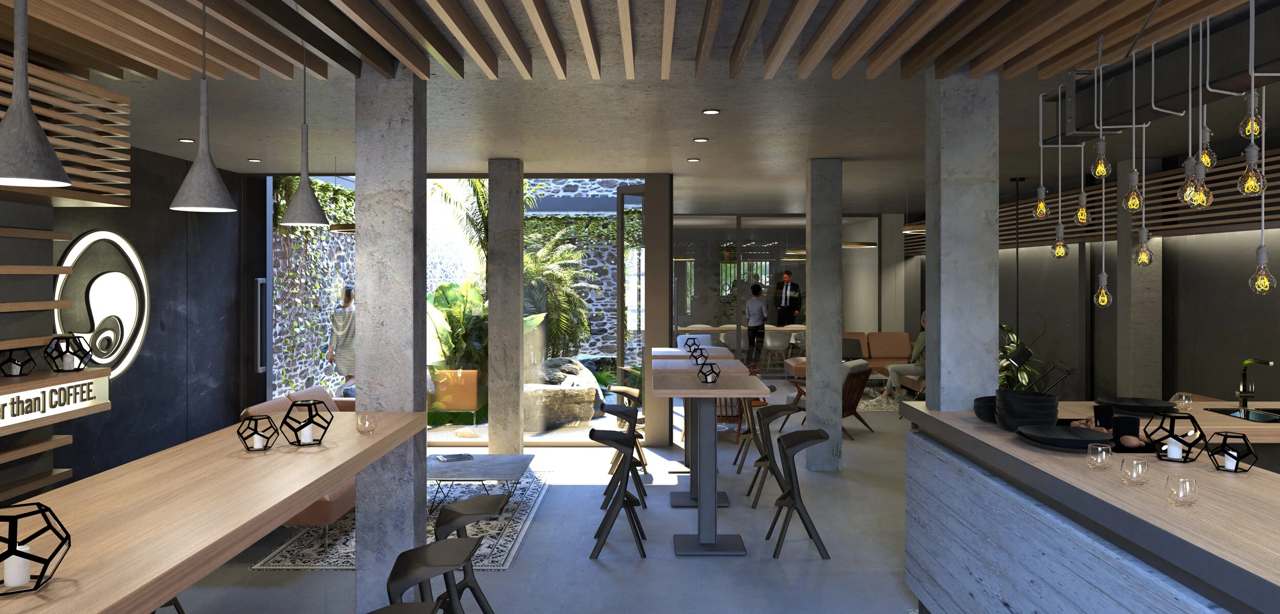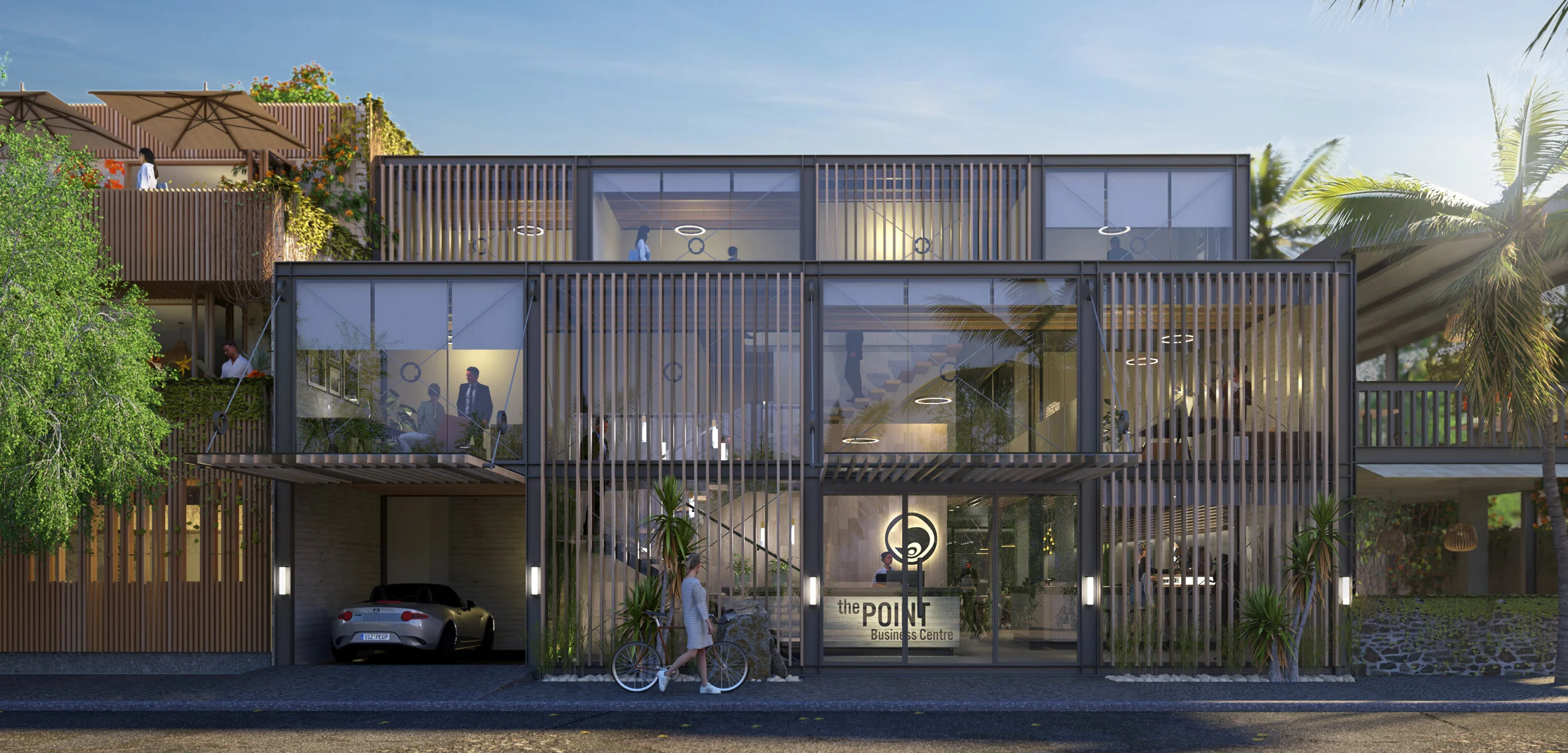 Situated on the street front within the compound of ‘The Point’ Resort, the office is a simple steel framed structure which provides space for a multifunctional facility. The design language used is different to the surrounding resort, this gives the structure a separate identity, bringing into focus its alternative usage and giving the street a more varied style.